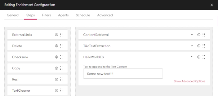 Next, we create an enrichment pipeline that uses our new enrichment step. We also include the content retrieval step and Tika text extraction.