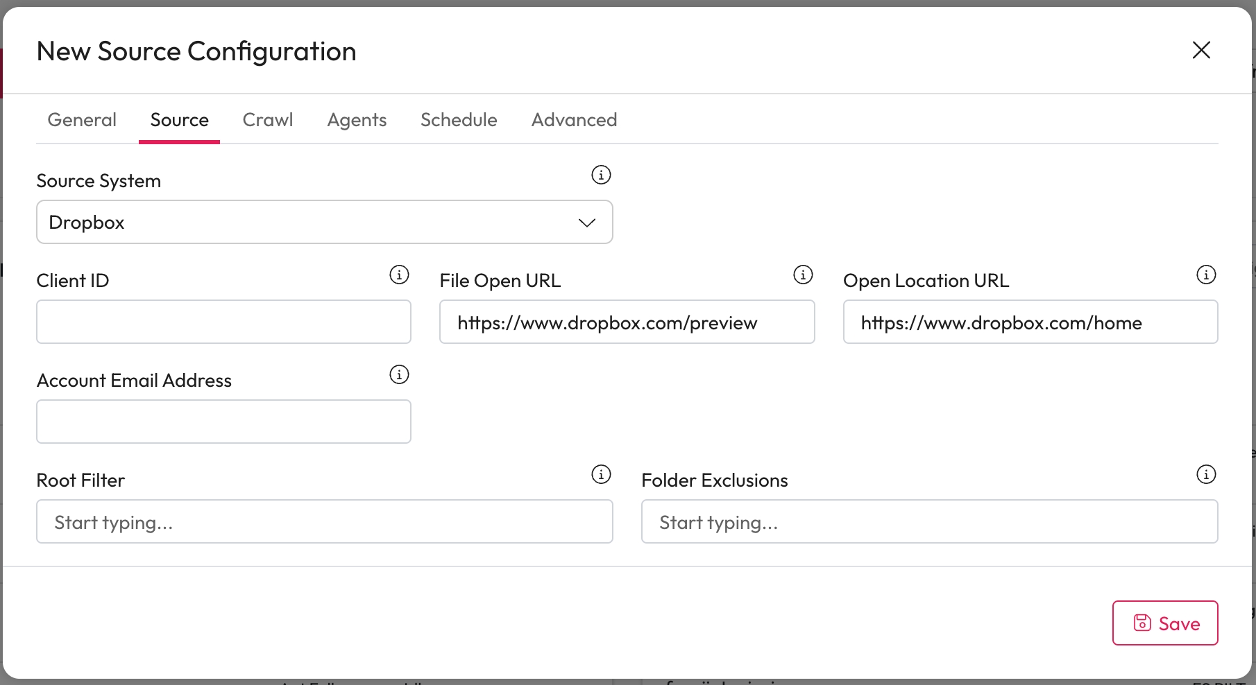 Folder Exclusions: Enter filters to exclude root folders from the crawl.