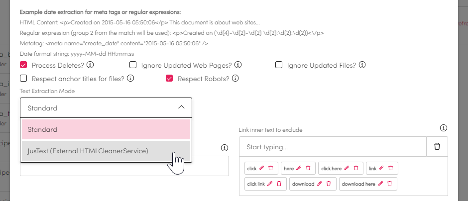 The HTML Text Cleaner service is an optional service that is used by the Web Sites source connector. It provides an alternative way to parse HTML into text that uses some intelligence to try and capture the main content from the web page, whilst ignoring the menus and other links around the main content.