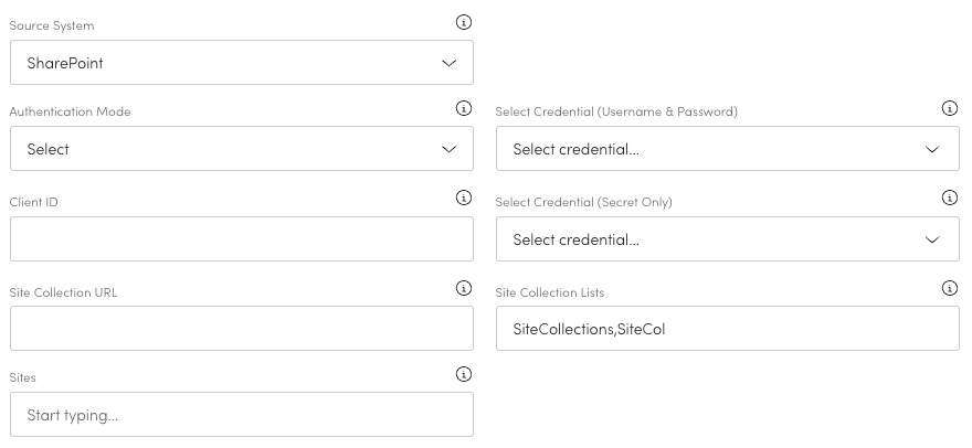 Connect your SharePoint source to Aiimi Insight Engine to make the most of your data. Once you have selected a Source System type more detail will expand to customise this.