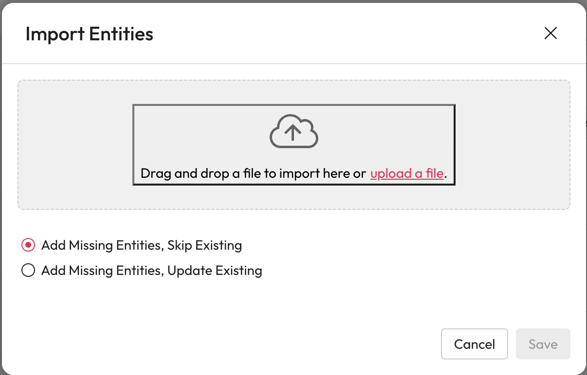 Add Missing Entities, Update existing entities - This will add any entities that do not exist and update all the current entities if there is a change in the file.