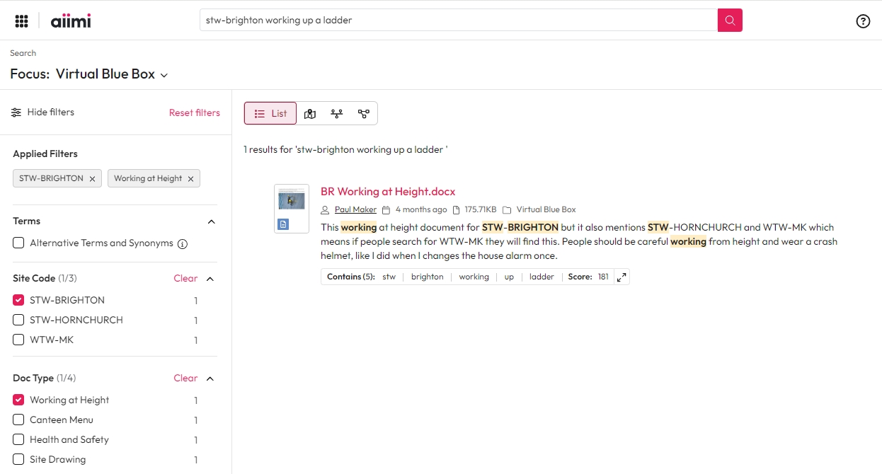 For example, you can map stw-brighton on the site code filter. With the use of smart synonyms, you can map 'working up a ladder' to the document type 'Working at Height'.