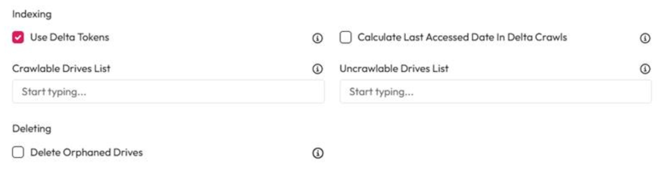 Use Delta Tokens: Check this to only crawl files that have changed. If unchecked, the crawl will include all files, this may cause performance issues.