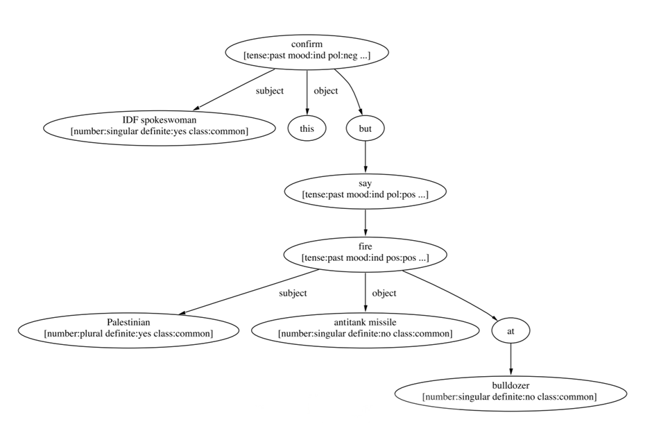 Most abstractive techniques condense a text corpus into a uniform format based on the structure of input sentences. Sentence Fusion [11], developed using news articles, aims to combine several sentences discussing a common theme into one. A tree structure is built describing the sentences based on the dependencies between constituent words. The figure below is the dependency tree describing the sentence “The IDF spokeswoman did not confirm this, but said the Palestinians fired an antitank missile at a bulldozer on the site.”