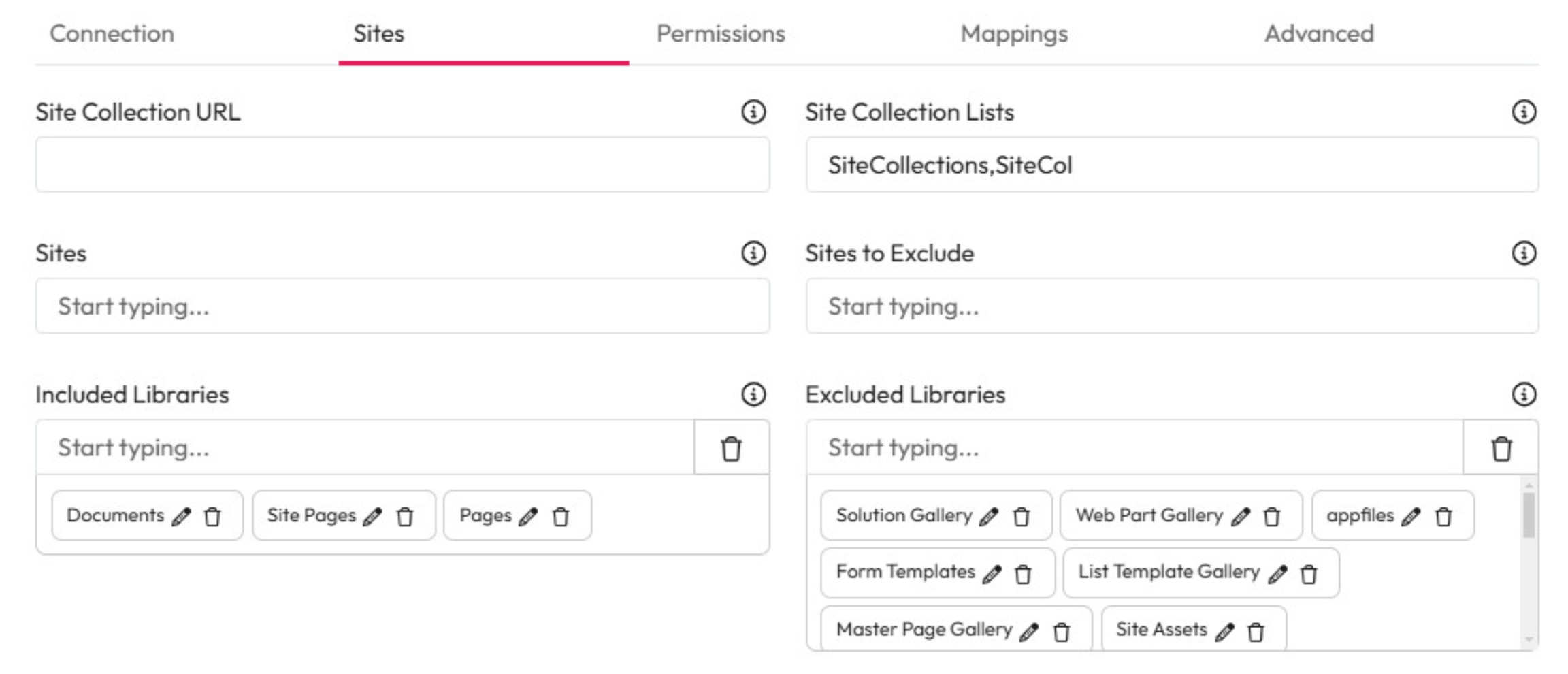 Sites - Choose the sites within the root collection to crawl.