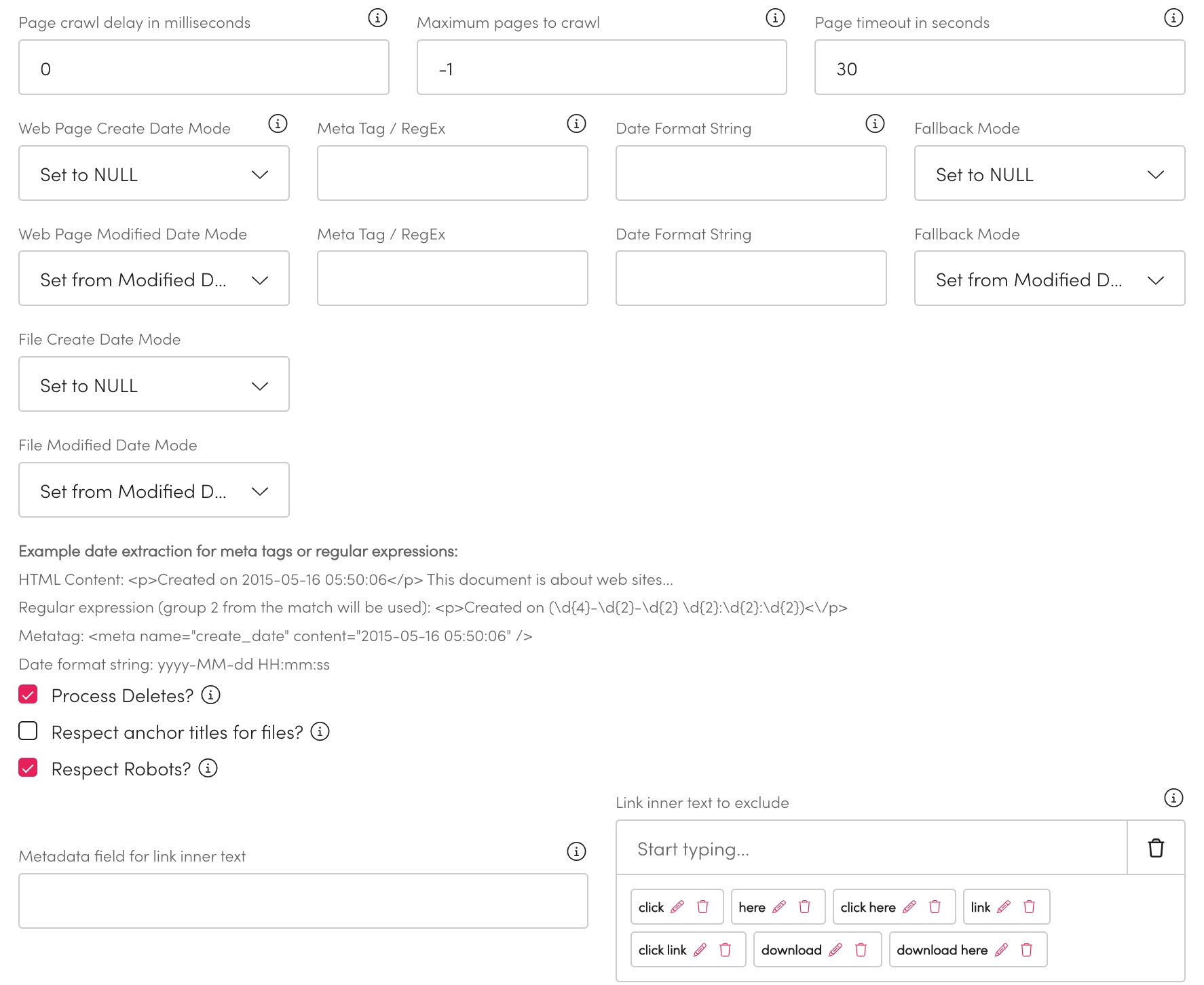 To ensure only websites are crawled check and enter any extensions in Valid web page extensions. This will stop any documents being scanned as a website.