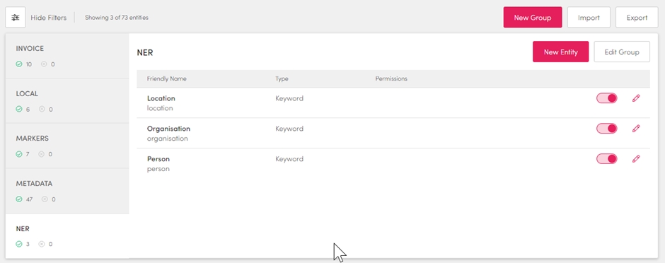 Let’s edit our example to add an ‘ner person’ entity (note that entity groups are always camel case and not upper case as shown in Control Hub).