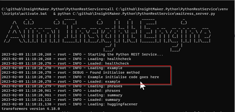 Next start the Python REST Service. You can do this from your virtual environment on the command line by running run.bat from the root folder, or just double click on run.bat from Windows explorer.