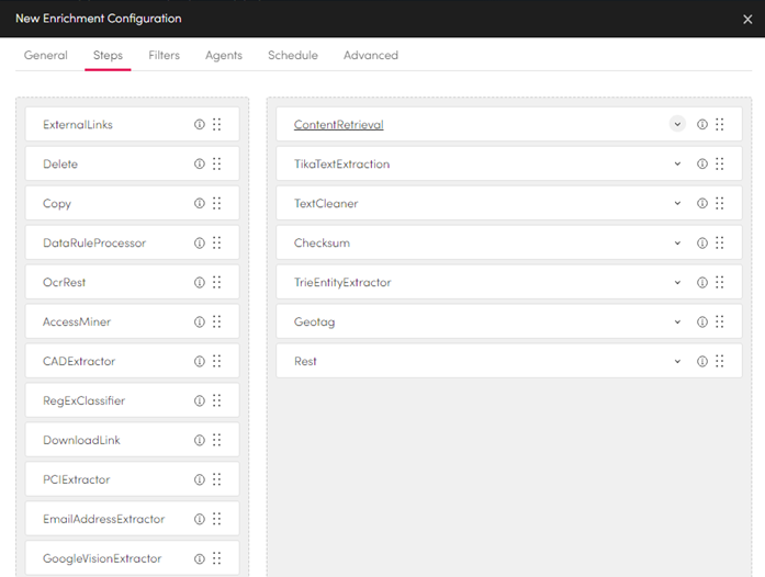 The enrichment agent is like a pipeline, it is a container for a series of enrichment steps. Each step is responsible for enriching the item being passed through. Example Steps include classification, named entity recognition, adding geotags and many more.
