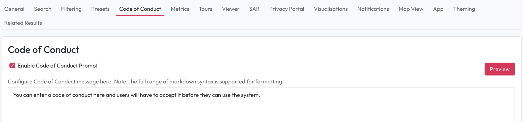 You can configure a code of conduct that users must accept before using the system. Whenever the code of conduct is updated, users must re-accept it before they can use the system.