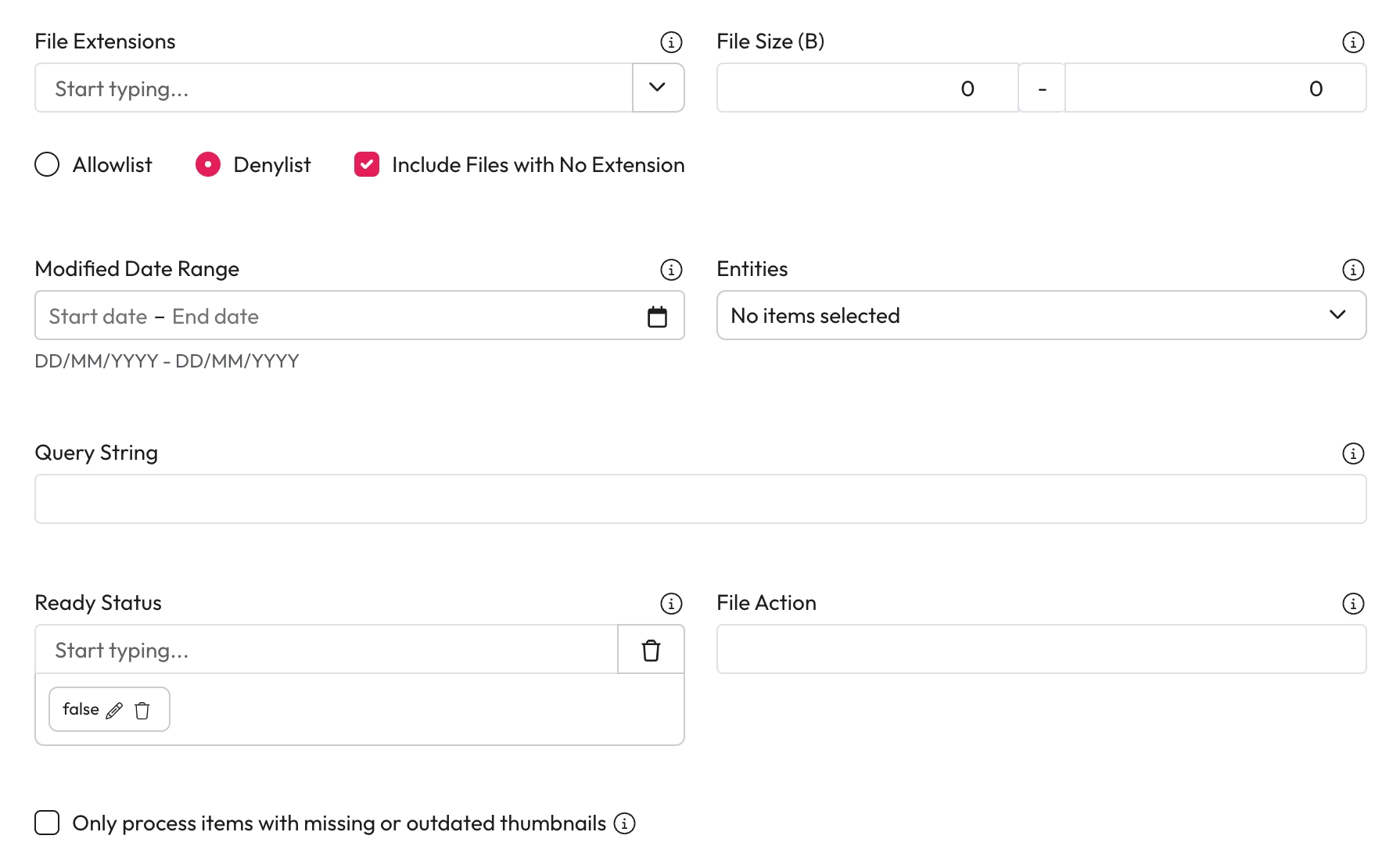 File Size - Enter a size range (in bytes) for the files that should be included.