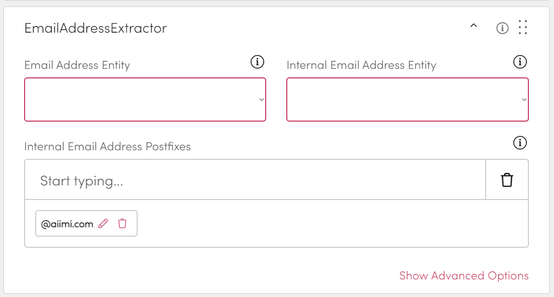 Select the entity to store internal and external email addresses, and then include any internal email address postfixes.