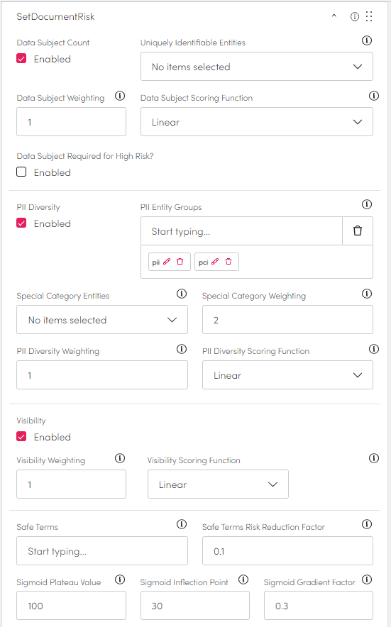 This step is used to set a documents or data items risk based on the entities present on the item. It can factor in data subject count, PII diversity and visibility.&#x20;