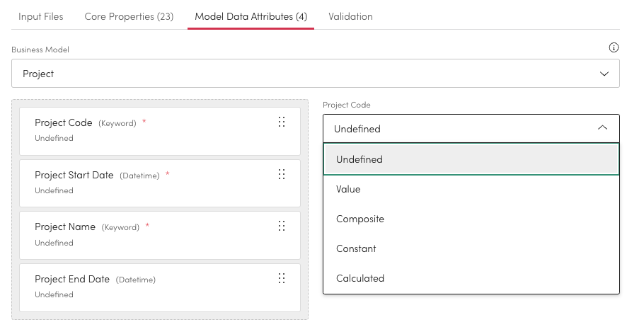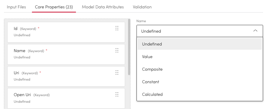You can configure the type for each file property. By default all properties will be undefined, you can choose between: Undefined, Value, Composite, Constant and Calculated.&#x20;