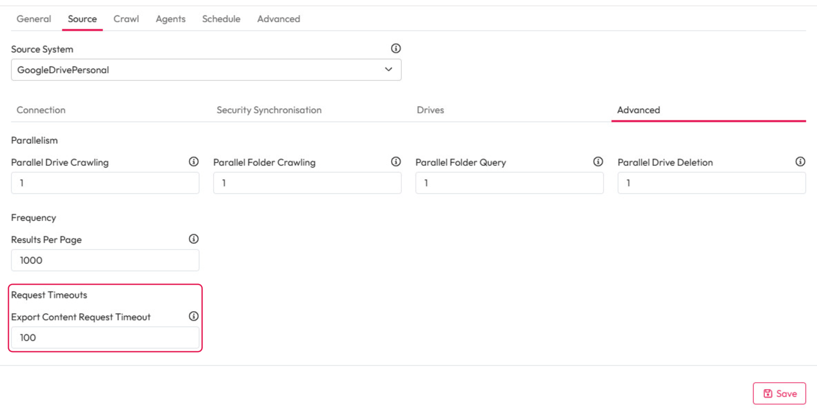 1. **Export Control Request Timeout:** Choose the number of seconds to wait for HTTP requests when exporting Google native content (e.g. Google Docs,   Sheets, Slides).&#x20;
