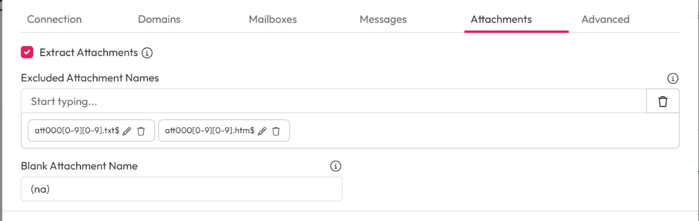 Excluded Attachment Names: Limit the attachments processed. Enter the attachment names you don't want to process using regular expressions.