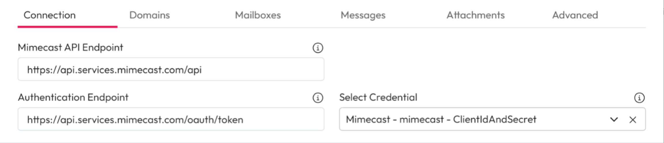 The Mimecast connector requires a Client ID and Secret credential. For support setting up a credential see our guide on creating Client ID and Secret credentials.