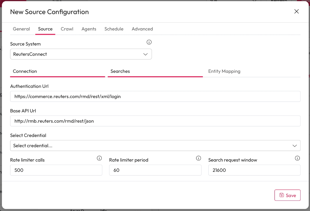 You can add specific searches and queries for a Reuters connection. If you add a search this source will only include results from Reuters that match that search.