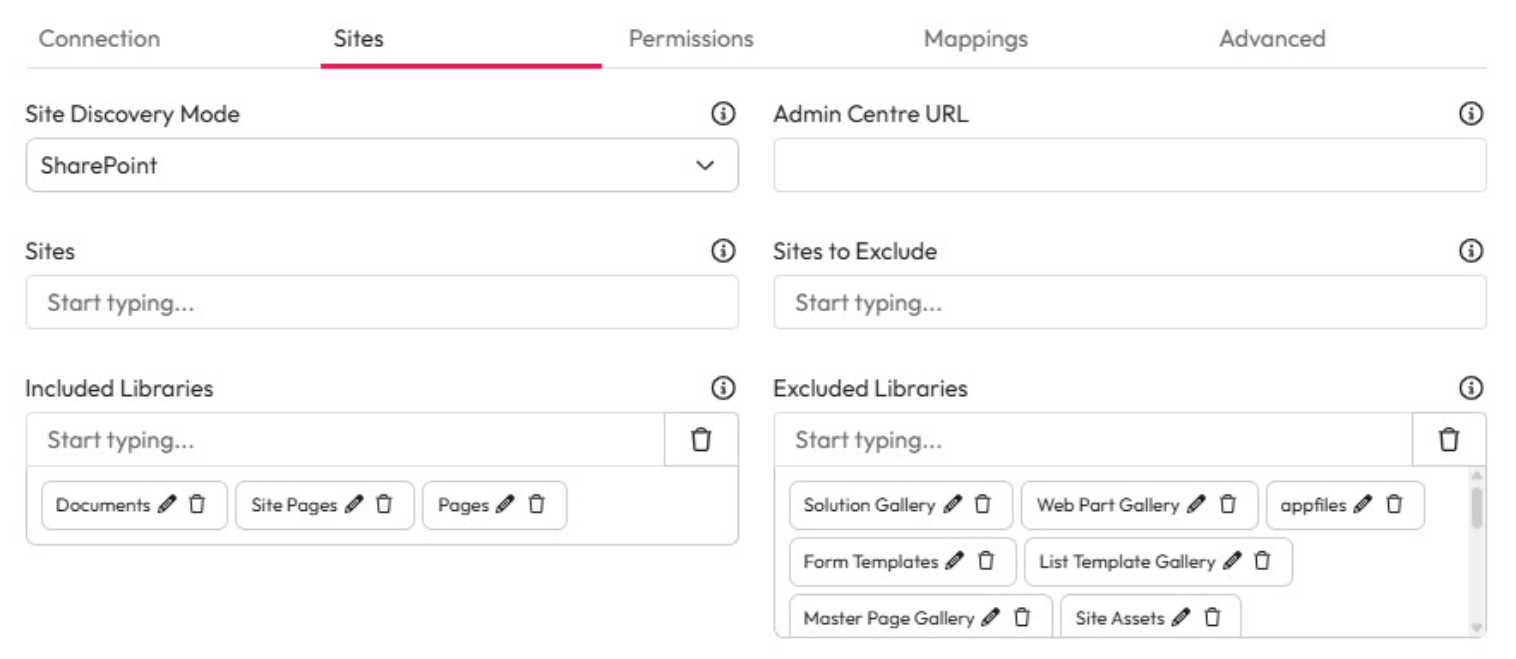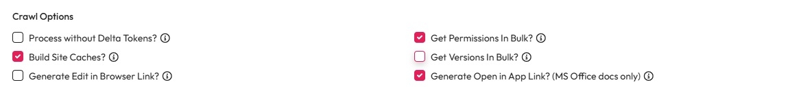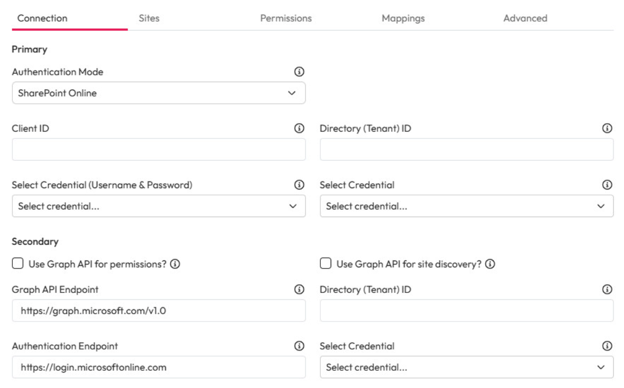 Use Graph API for Site Discovery - If checked, the Graph API will be used to retrieve all sites, site collections and one drives.