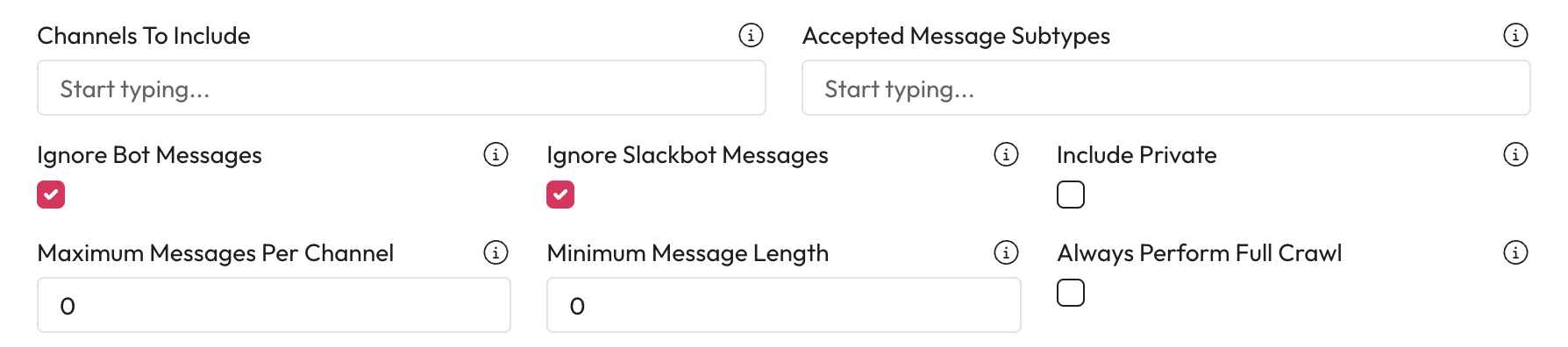 4. **Ignore Slackbot Messages:** Check this to not index messages from the Slackbot user.&#x20;
