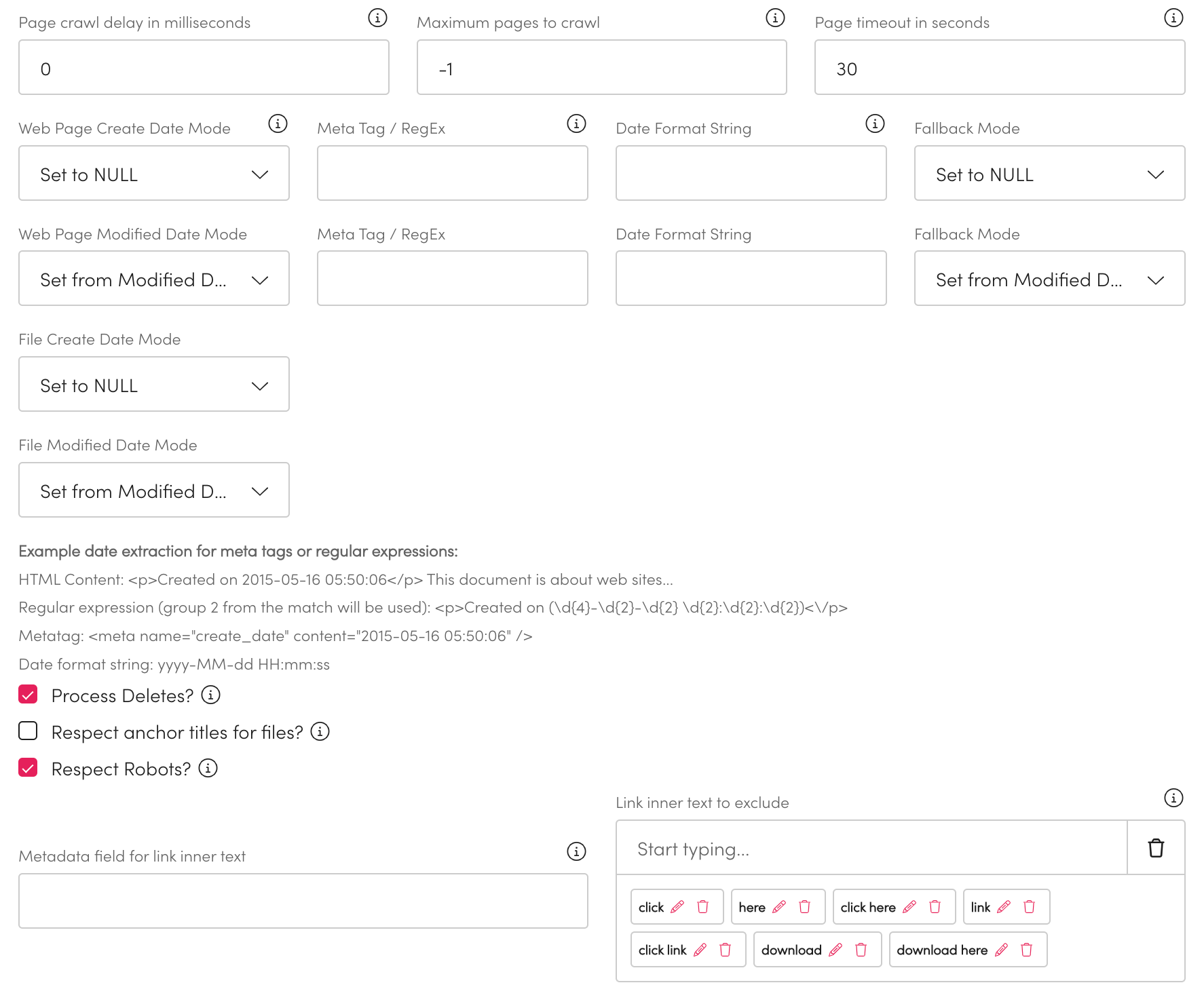 To ensure only websites are crawled check and enter any extensions in Valid web page extensions. This will stop any documents being scanned as a website.