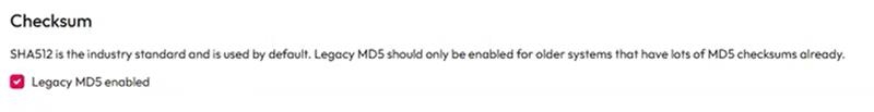 Legacy MD5 enabled - Check this to use SHA512 and Legacy MD5 for checksums.
