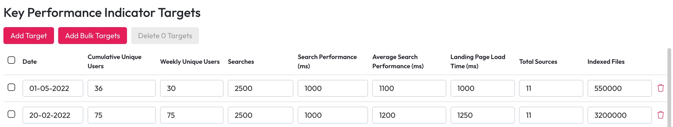 By configuring a commandJob, Workplace AI will pre define 6 KPI metrics. These can be viewed by end users in a Metrics dashboard. In order to provide extra context, administrators can add targets for each KPI that will appear on the dashboard.