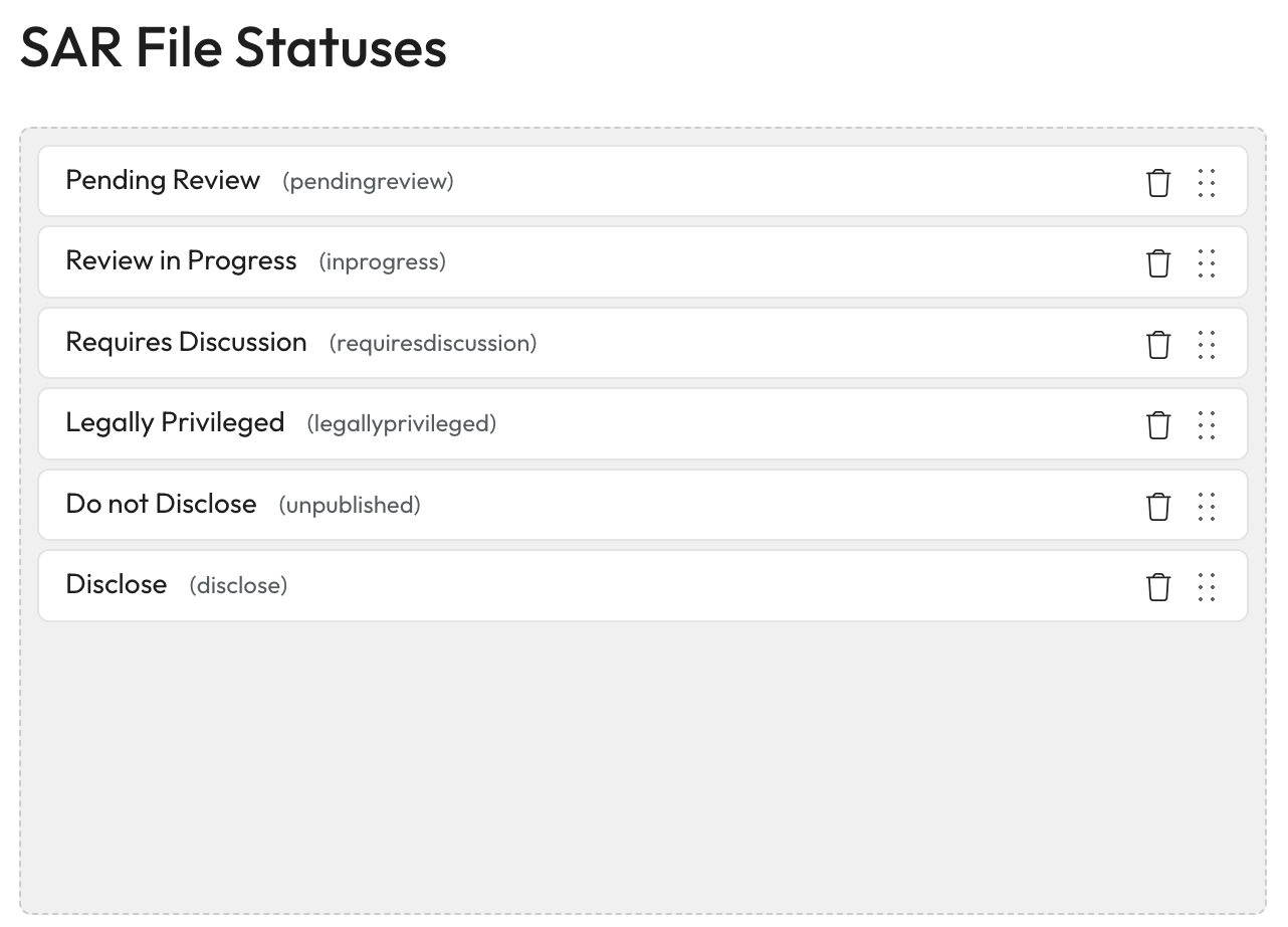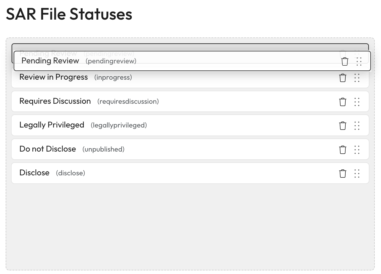 Take control of the statuses available for items within a SAR. You can create new statuses, rearrange the order and edit and delete existing statuses.