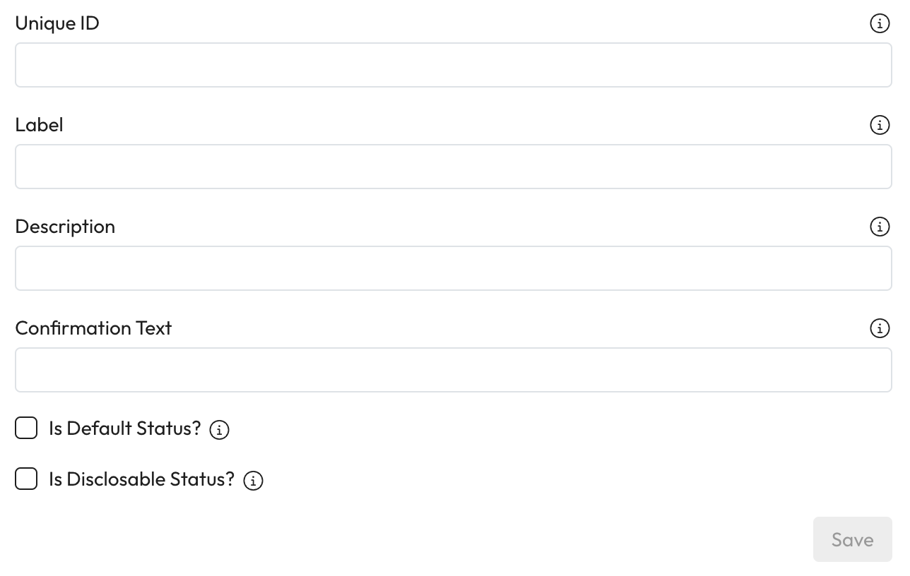 Unique ID, Label, Description, Confirmation Text, Default Status, Disclosable Status.