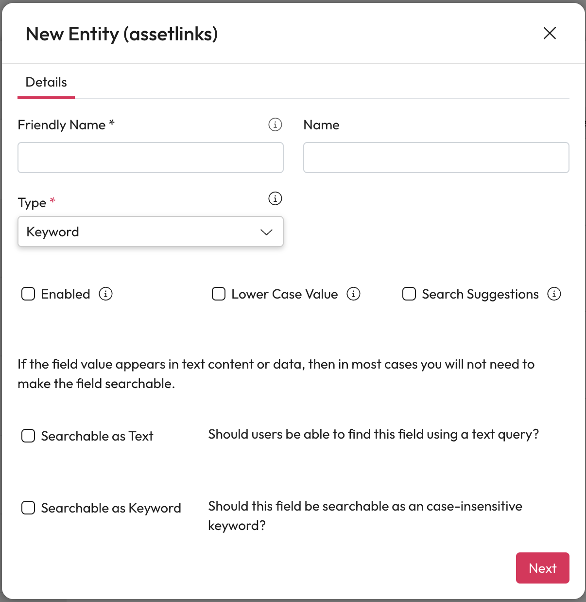 * Choose between Keyword, Long, Double, DateTime GeoPoint, Text, Float, User or Uri.