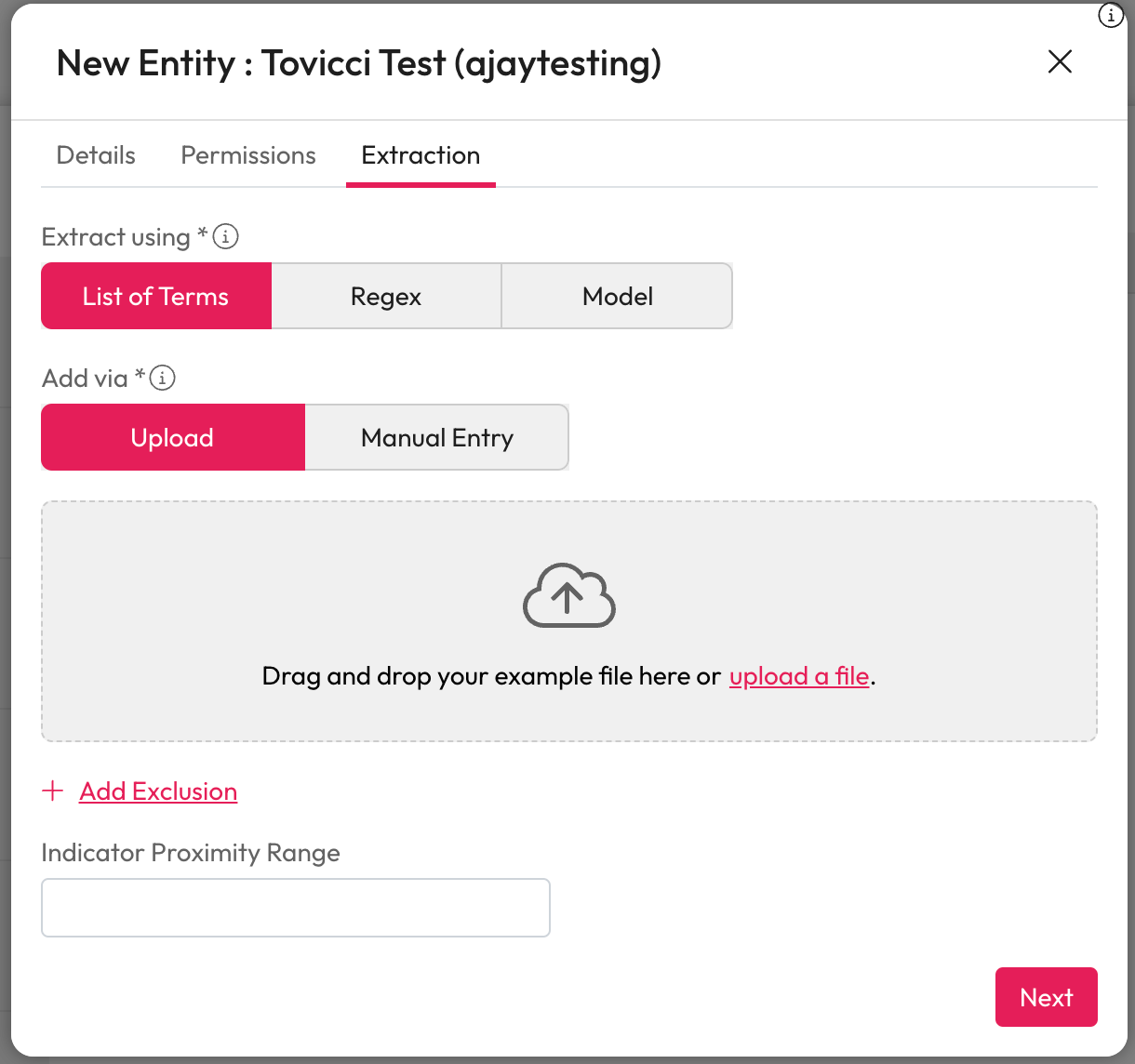 List of Terms - Select this to extract using a dictionary of terms. You can upload your list or add the terms manually.