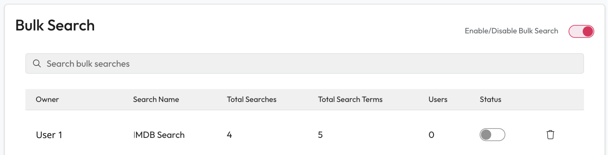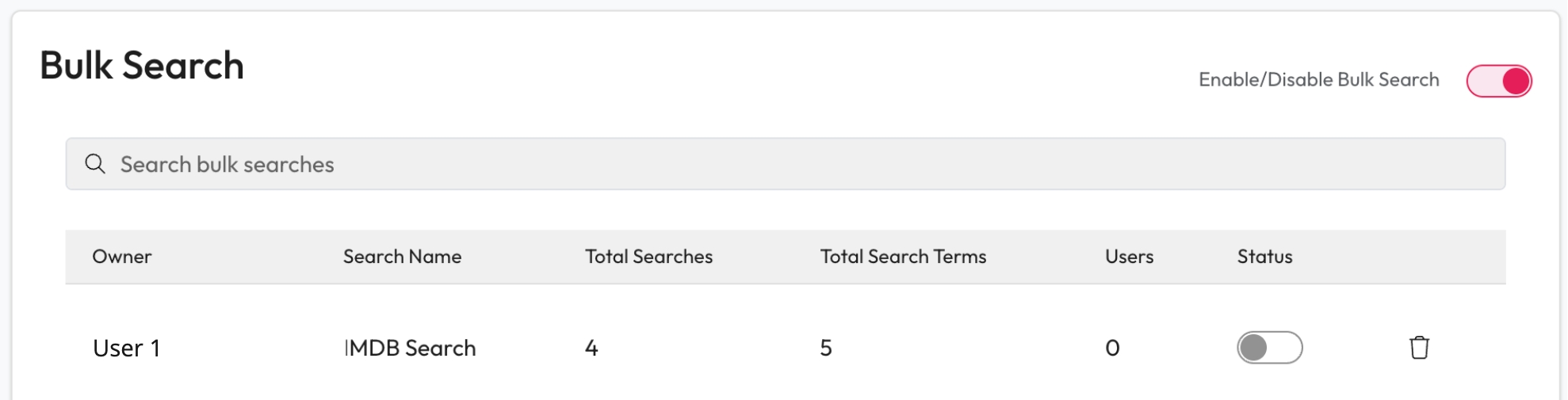All bulk searches can be turned on and off or deleted by and admin from this table. By default all searches will be enabled.