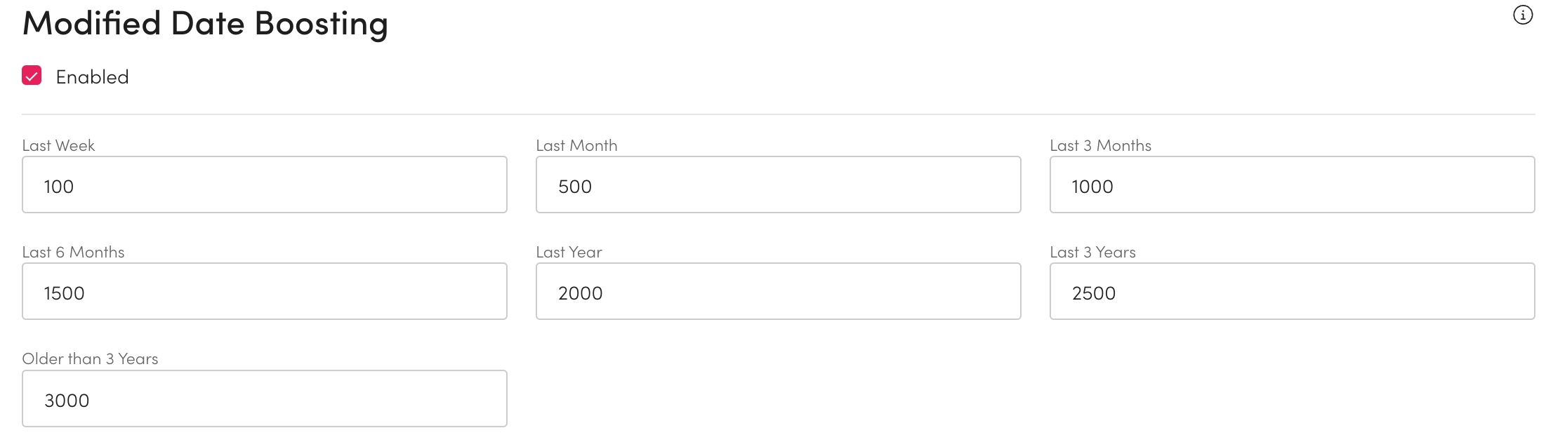 Boost data on the modified date. This will make more recent items appear higher in the search results list. This ensures that when a user executes a search, they are returned the more recently modified documents first. This is used with other algorithms to order the search results.