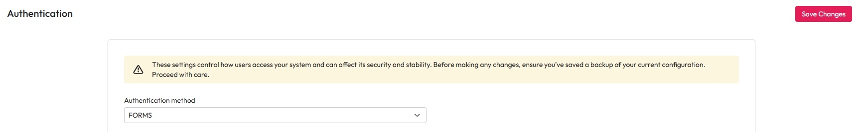 After saving the new authentication settings, all authenticated sessions will be invalidated, provided the "Invalidate tokens on logout" setting is enabled