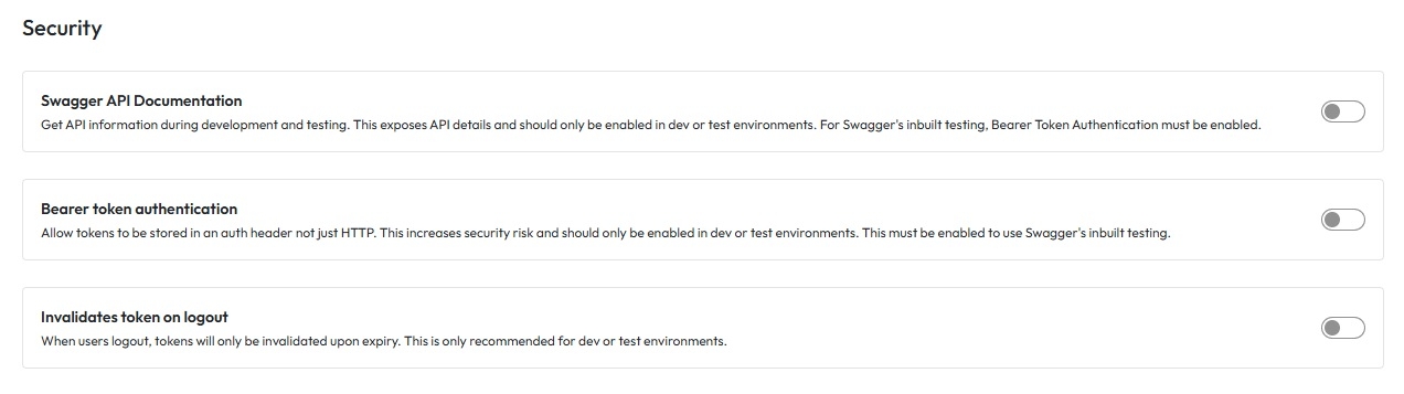 Get information about your APIs during development and testing. This exposes your API details and should only be enabled in dev or test environments. To use Swaggers inbuilt testing the Bearer Token Authentication must be enabled.