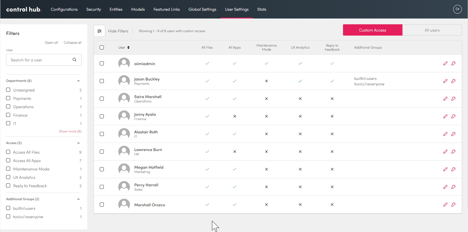 Select Custom Access for users who have had settings applied manually in the Control Hub.