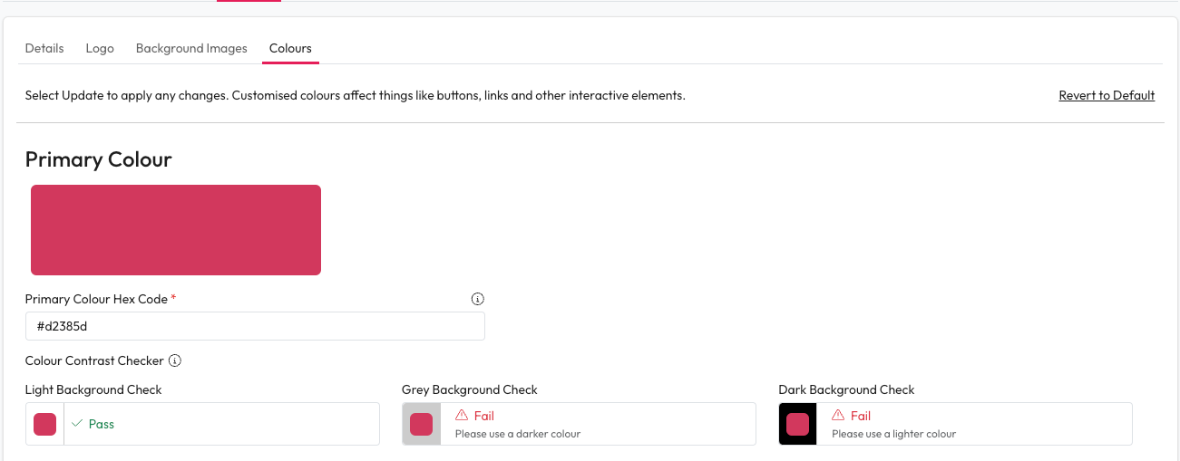 Customise the 3 main colours used across the system. We recommend these match your brand.