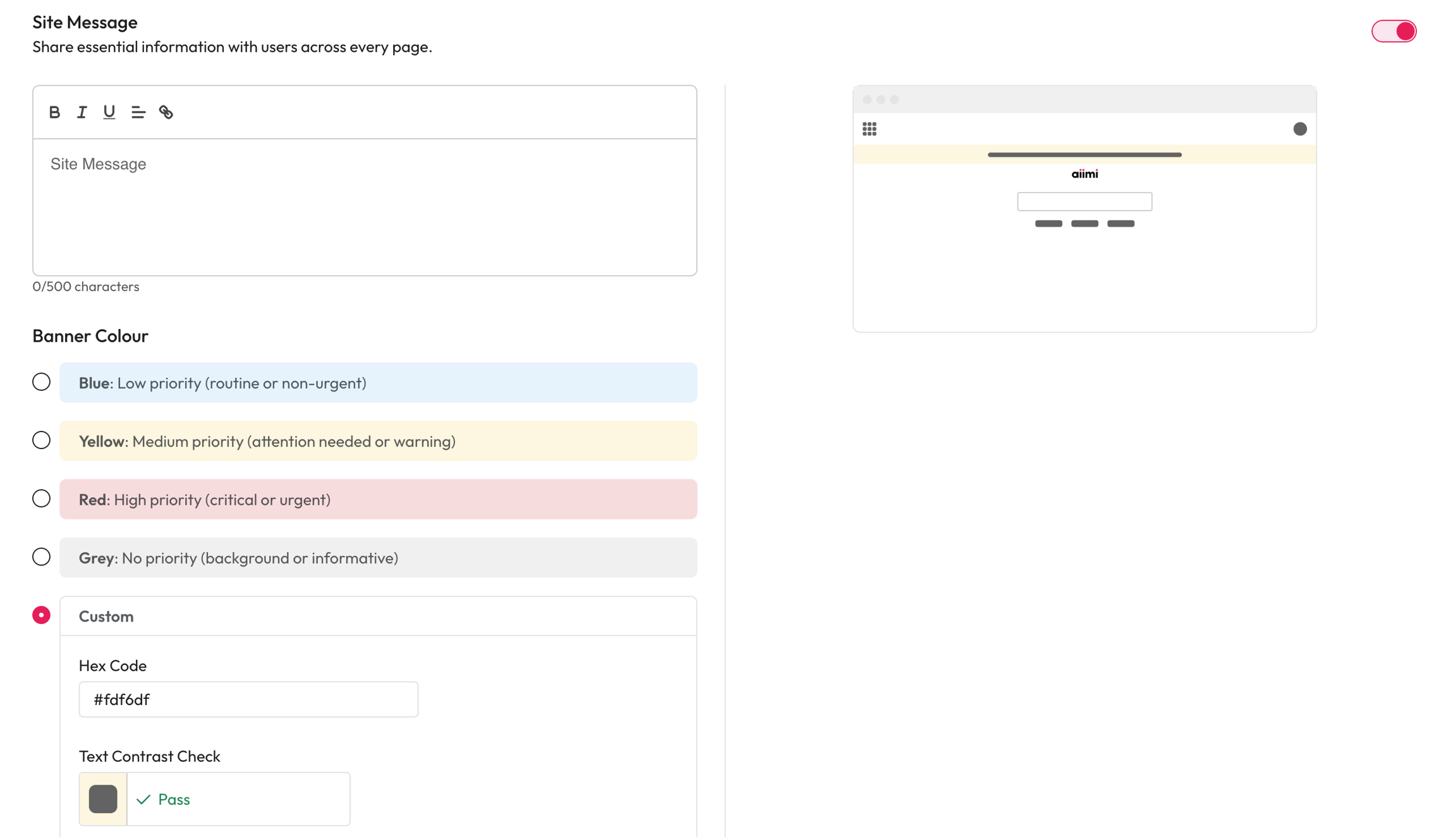 Site Message - Enter the text you want to be displayed across the application.