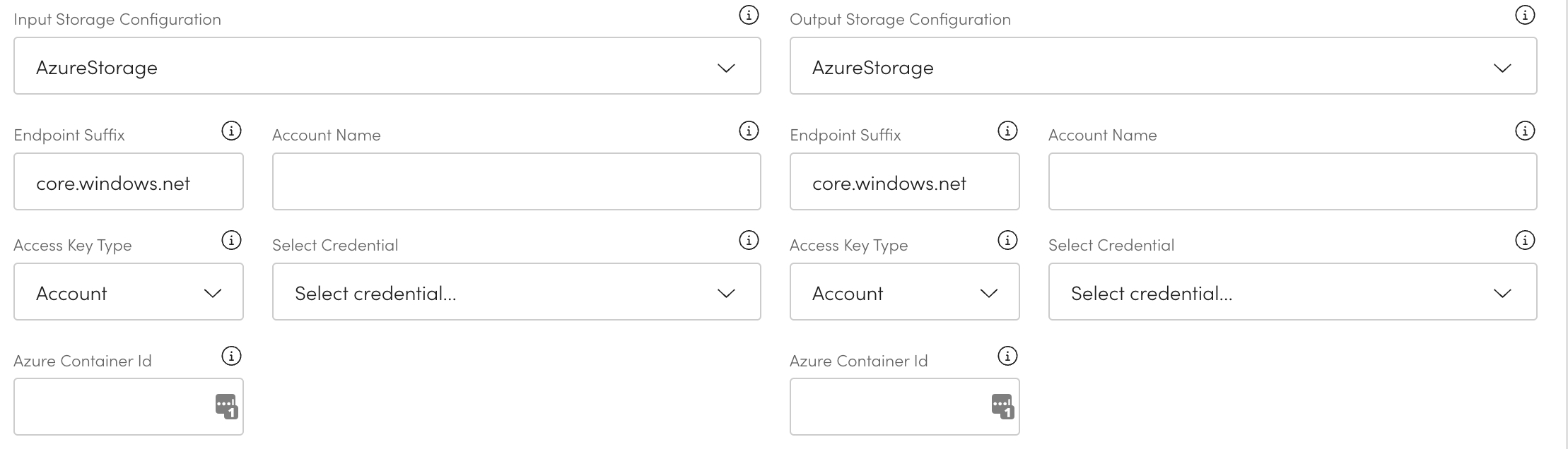 You can have a different storage configuration for the input and output. Depending on your chosen storage you will need to populate different information.