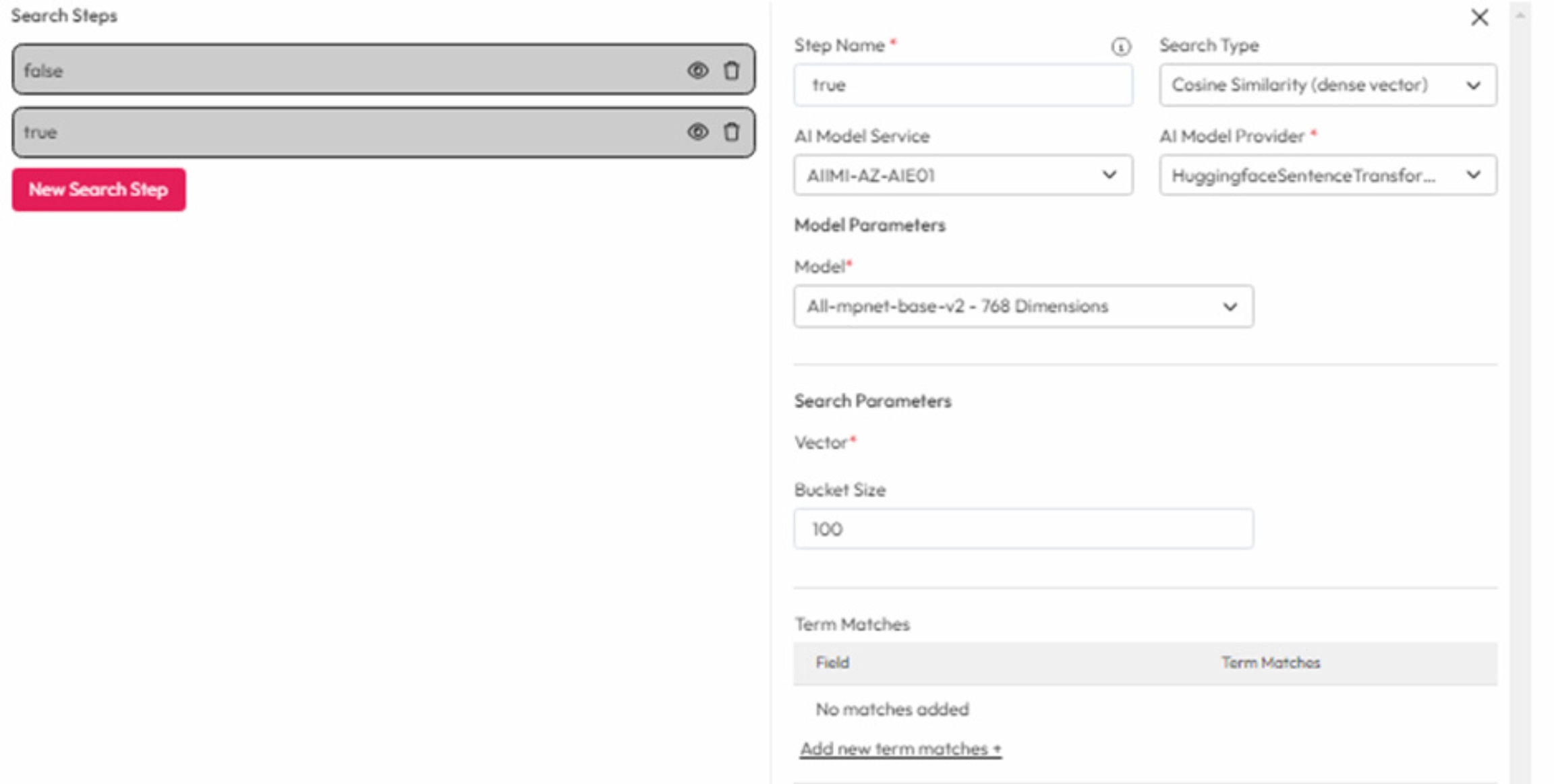 A true step will direct a question based query to a semantic search. This must be set as a Cosine Similarity search type. This runs a hidden keyword search, takes the defined number of results and reranks them based on Cosine Similarity.