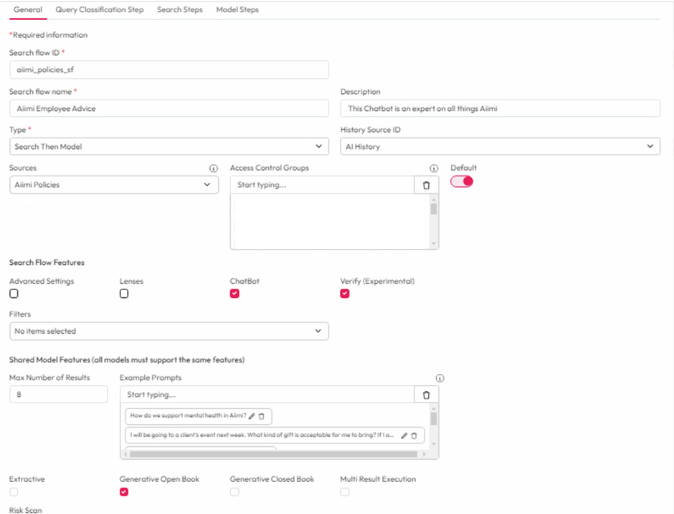 Search Flow Features: Check "Lenses" and "Chatbot".