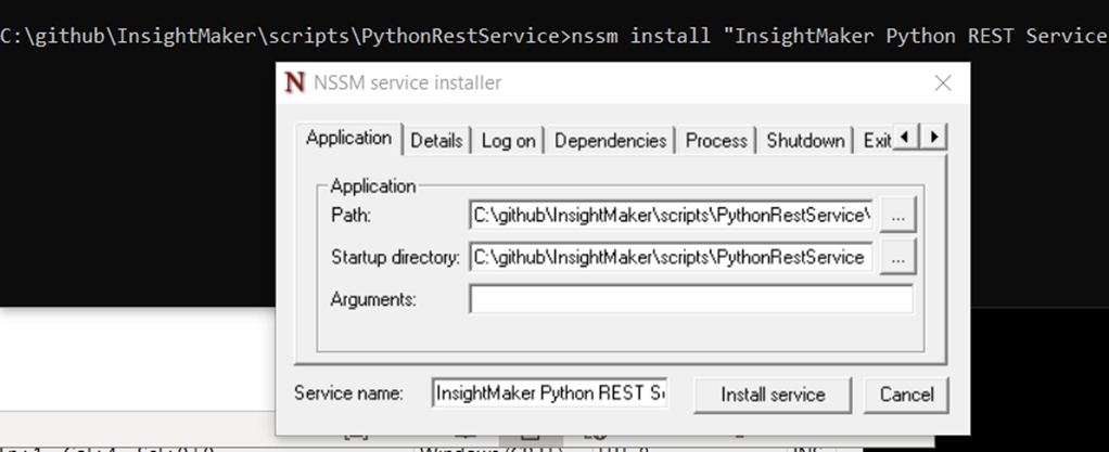 5. Execute: nssm install “InsightMaker AI Enrichment Service”.