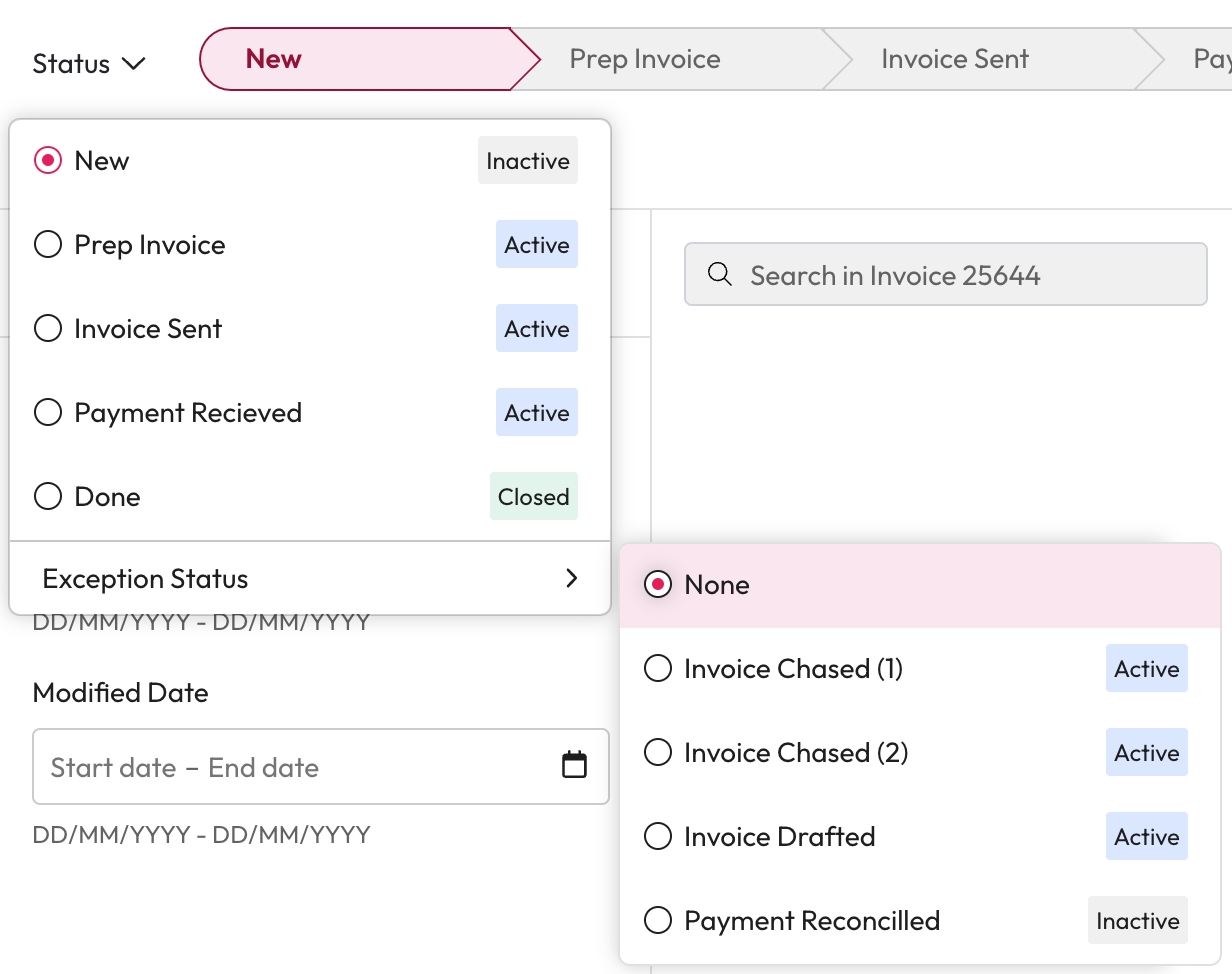 This is a status that can be a temporary or alternative state for the Core journey. For example within the Invoice Sent core status, Invoice Chased may be an exception status.