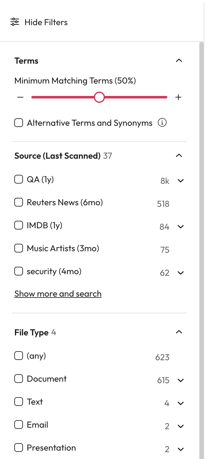 Narrow down your results to more easily find relevant documents. You can apply a filter based on things like Source, Date Created, Owner, etc.