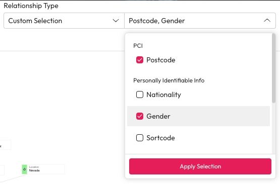 PCI relationship types may consist of entities like Card Numbers, CVVs, and Bank names.