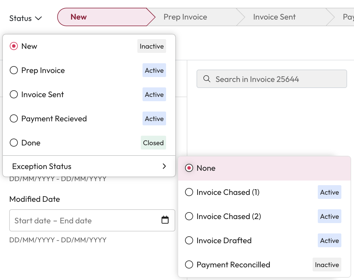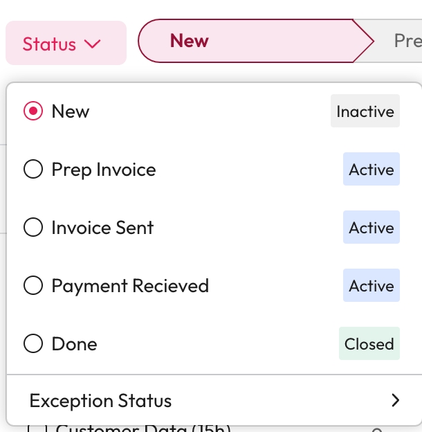 This is a status that can be a temporary or alternative state for the Core journey. For example within the Invoice Sent core status, Invoice Chased may be an exception status.