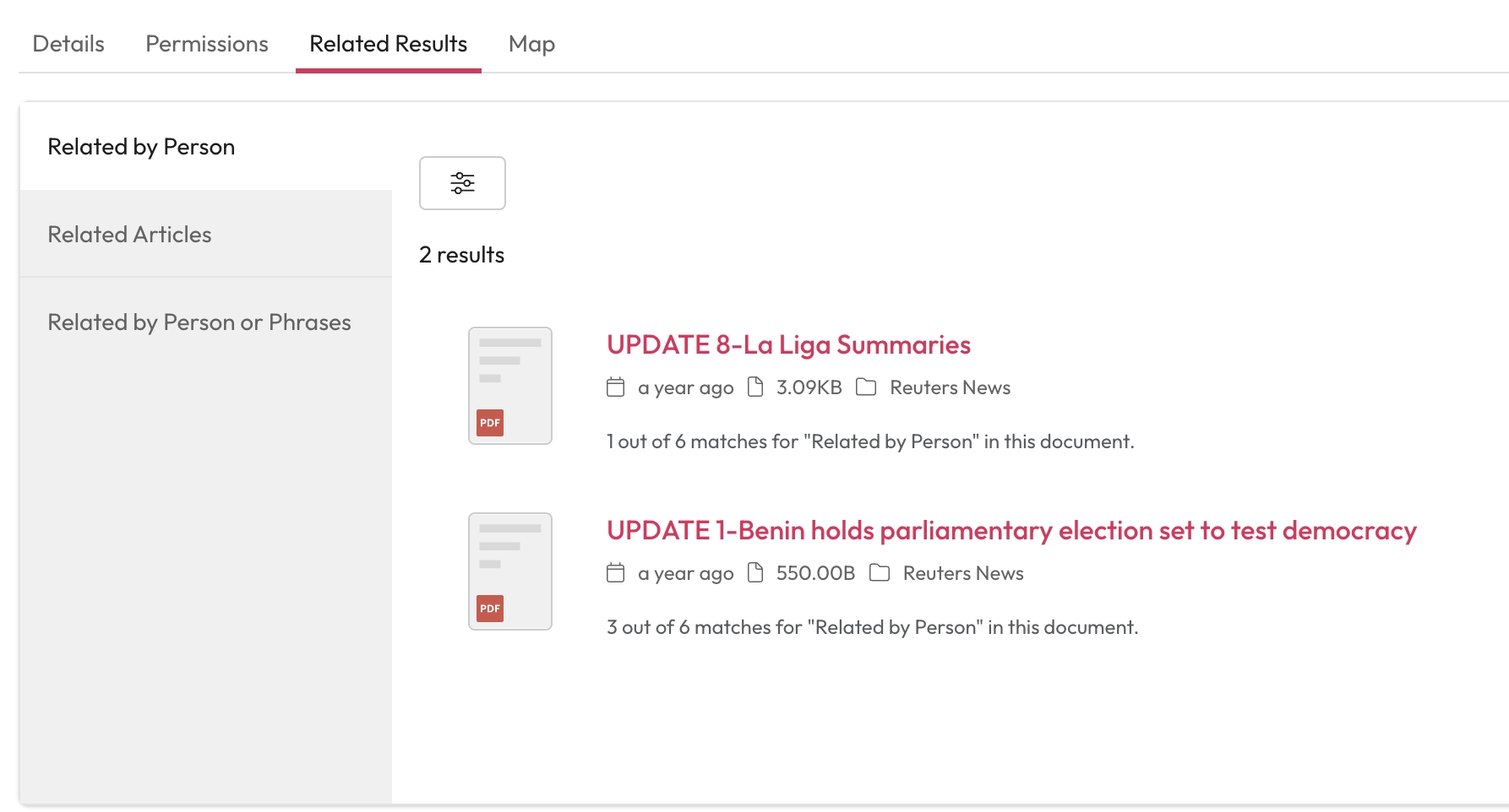 Related results help you discover documents you may not otherwise find. Just because they are related doesn't guarantee they will appear in the same result list. They are defined by results that share certain information. This could be a PO number, persons name or phrase. These connection types are defined by your admin.