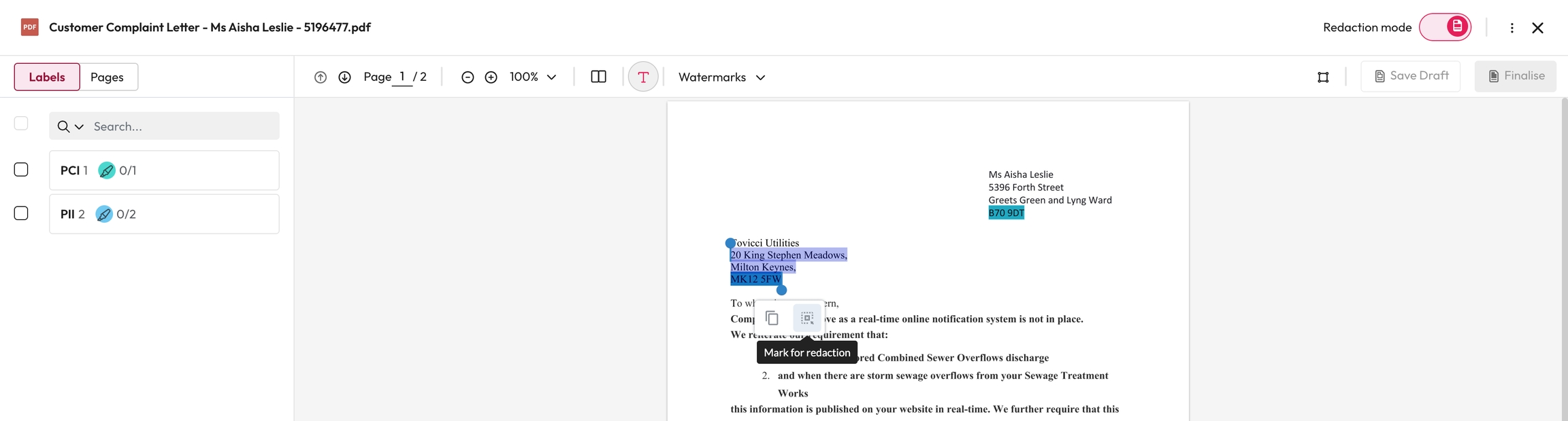 Draft redactions can be used if you need to come back to it later or to get others to review a document before a redaction is finalised.