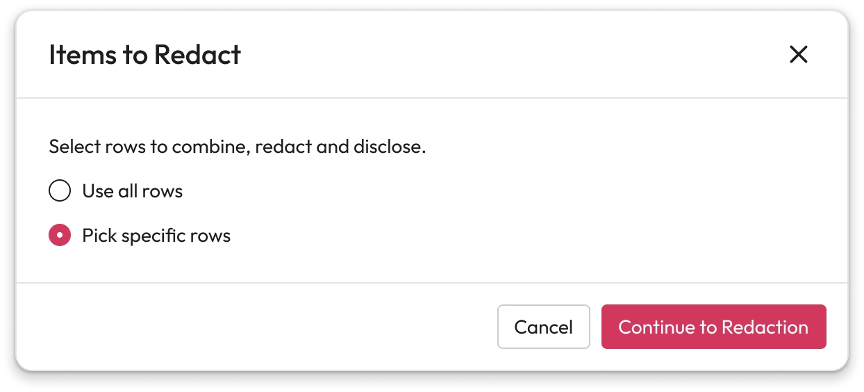 When redacting a data record, it is converted to a PDF before you can add any redactions. You can choose to include all rows or pick the rows you want for the PDF.