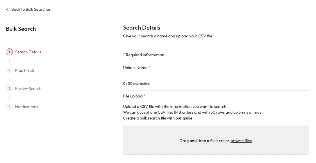 When creating your CSV the first column must always be the Search Name. It must have the title "Search Name" or it will fail to upload. You can arrange the rest of the file as you need.